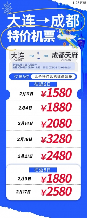 大连成都往返6/8日特价机票